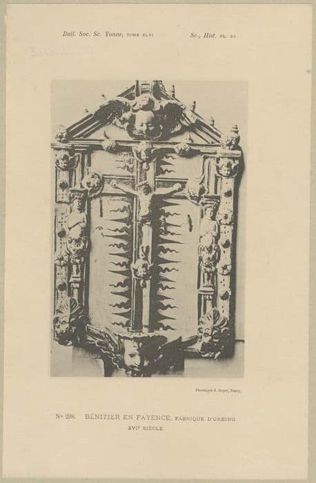Inv. 298. Faïences, poteries, verreries : grand bénitier en faïence polychrome. Au milieu, le Christ en ivoire sur fond bleu rehaussé de rayures jaunes. Dans le haut taillé en toit, tête d'ange en relief. Dans le bas, bénitier creusé dans une tête d'ange. Sur les côtés formant cadre, deux jolies cariatides dont les gaines sont supportées par deux mufles de lion portant des anneaux. Autour de la croix quatre petites figures d'anges bouffis armés d'ailes. Autour du cadre semis de marguerites et ornements en relief.