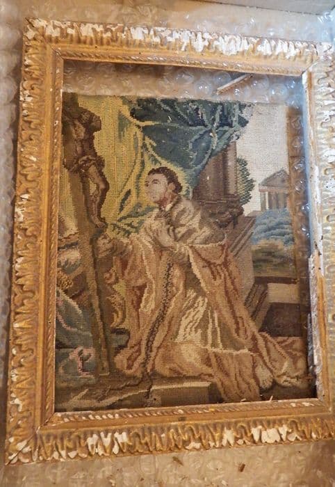 Inv. 321. Tapisseries : tapisserie. Tableau entouré d'un cadre de bois doré, représentant, en tapisserie, avec une exécution de valeur médiocre, saint Charles Boromée agenouillé aux pieds du Christ.