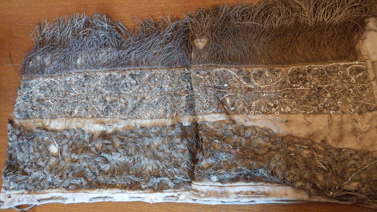 matériau textile : damas, brodé ; fil métal : argenté, filigranes