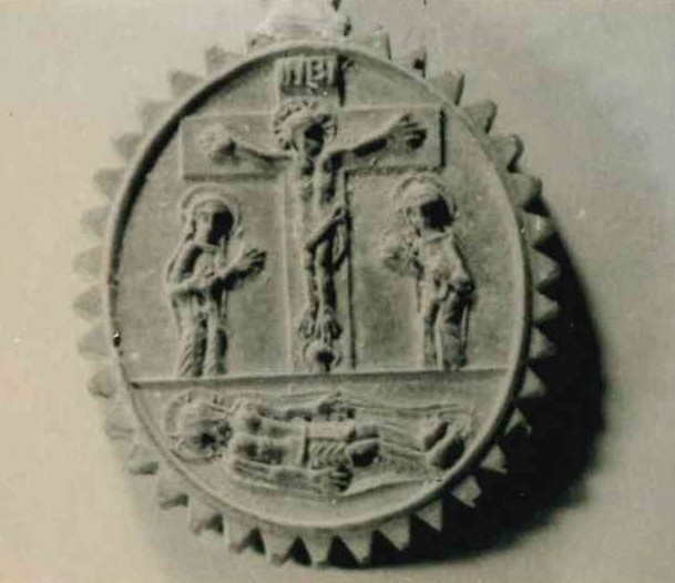Médaillon représentant d'un côté le Christ crucifié, entre la Vierge et saint Jean (au bas est le Christ au tombeau), et de l'autre côté, l'ensevelissement de la Vierge.