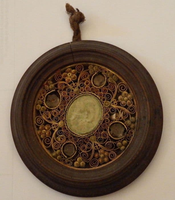 Inv. 355. Varia : médaillon et reliquaire. Cadre circulaire en bois doré, contenant un médaillon en relief, représentant la Vierge tenant l'enfant Jésus qui joue avec saint Jean-Baptiste, et en outre un reliquaire dont les reliques ne sont point désignées.