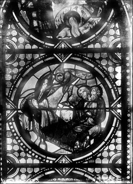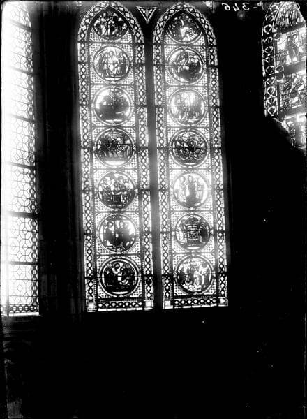 Q sur le plan. Fragments de scènes. Verrière à 2 lancettes qui contiennent chacune 7 médaillons.