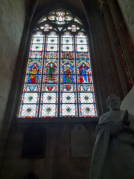 Fragments de vitraux. Deux verrières reconstruites en 1897 à l'aide de nombreux panneaux du 14e siècle.