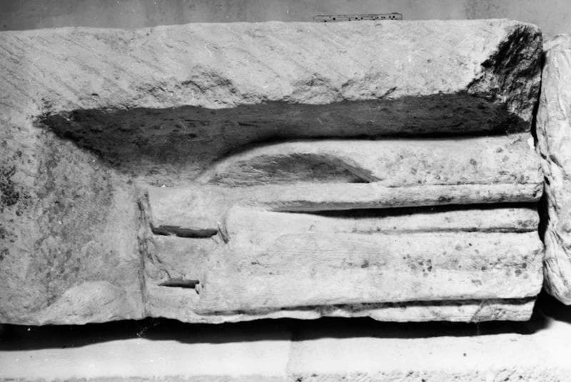 Fragment de stèle. Sert de console à la statue de la Vierge de l'Annonciation. Ce fragment représente la partie inférieure d'un personnage debout dans une niche vêtu d'une tunique sur laquelle s'étend un manteau aux amples plis et qui descend jusqu'à la cheville. Le pied est posé verticalement et se termine en pointe. Une petite plaque de cuivre fixée sur la stèle comporte l'inscription suivante : Stèle funéraire gallo-romaine provenant d'un proedium primitif remployée dans la construction du martyrium chrétien SBAS, XXXIX, 1937.