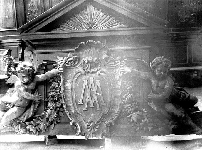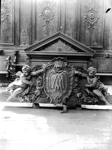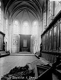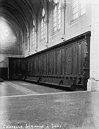 Sculptées en 1730 par Barasset à Paris et déposées en 1869.Proviennent de la cathédrale (proviennent des stalles hautes du choeur). L'archevêque de Sens, Maurice Feltin écrit ceci le 27 mars 1935 : <I>Monsieur le maire, Vous savez, sans doute, que j'ai entrepris, poussé par les circonstances, l'agrandissement du Grand Séminaire. J'ai dû en particulier y construire une chapelle. Or il me revient de divers côtés que dans l'ancienne chapelle du Grand Séminaire aujourd'hui occupée par l'Ecole primaire supérieure des garçons, se trouvent des stalles qui ne sont d'aucune utilité, qui sont même un embarras. Aussi je me permets de vous demander s'il ne me serait pas possible de les avoir : elles serviraient à meubler la nouvelle chapelle en construction. </I> Un rapport de Jean Verrier en octobre 1935 indique ceci : <I>En mars dernier, Mgr Feltin,a rchevêque de Sens, a demandé au maire de cette ville si la Municiplaité consentirait à la cession, pour la chapelle du nouveau séminaire, des stalles de la chapelle de l'ancien séminaire devenu propriété de la ville depuis 1907. Le maire de l'époque, M. Gaudaire, avait accepté en principe cette session mais avait formulé une réserve en raison du classement possible des dites stalles. L'affaire était restée en instance en raison des élections municipales et la nouvelle municipalité demande, par lettre du 19 octobre, à donner suite à la requête de Mgr Feltin. Or il résulte du rapport ci-joint de l'architecte en chef Haubold que si l'arrêté de classement du 10 novembre 1907 mentionne les stalles et les boiseries de la chapelle de l'ancien séminaire, ces dernières seules offrent un intérêt artistique suffisant pour justifier cette mesure, les stalles n'étant qu'une copie moderne des stalles de la cathédrale. D'accord avec M. Haubold, j'estime qu'il conviendrait, dans ces conditions, de déclasser les stalles et d'aviser la ville de Sens qu'elle peut sans inconvénient en disposer en faveur de l'archevêché ; celui-ci ayant pris l'engagement de faire les frais de transport ainsi que de l'établissement, sous les lambris classés qui resteraient en place d'un lambris très simple dont M. Haubold ferait l'étude. Il conviendrait aussi de demander à la ville de Sens de donner à cette salle, que son décor de boiseries anciennes rend particulièrement intéressante, une destination convenable et d'effectuer les menues réparations qu'exigent certaines parties du bâtiment et des boiseries.</I> Le 4 juin 1955, lettre de M. Perchet au Directeur de l'Enseignement technique : <I>J'ai l'honneur d'appeler à nouveau votre attention sur la protection des boiseries classées dans l'ancien séminaire de Sens, actuellement collège technique. Vous avez bien voulu me faire connaître les difficultés auxquelles vous vous heurteriez si vous deviez installer les ateliers du Collège dans un local mieux approprié et où les boiseries n'auraient pas à en souffrir. Je comprends les raisons que vous invoquez mais il n'en est pas moins indispensable d'assurer la conservation des parties classées de l'édifice. La solution que vous proposez de desceller les boiseries et de les transporter à l'abri est difficilement pratiquable. En effet indépendamment des incidences financières d ece projet, une étude faite par M. l'Architecte en chef des monuments historiques cahrgé du département de l'Yonne a permis de conclure qu'aucun édifice de Sens n'est susceptible d'abriter ces boiseries. Il est certain en outre que le démontage et la repose de ces dernières risqueraient de compromettre définitivement leur conservation déjà précaire. C'est pourquoi j'estime nécessaire de ne pas les déplacer. Mais afin de leur assurer un minimum de protection, je vous prie de bien vouloir faire exécuter les aménagements suivants dont la réalisation devra être prise en charge par le collège tehcnique : - déplacement des tuyaux de poële voisinant avec les corniches et des porte-manteaux qu'il est inadmissible d'avoir cloués à même les boiseries sculptées ; - établissement à la distance d'un mètre en avant des boiseries et tout le long de leur développement d'une grille de protection dont le modèle et l'emplacement devront être acceptés par M. Trouvelot, architecte en chef des Monuments historiques.</I>