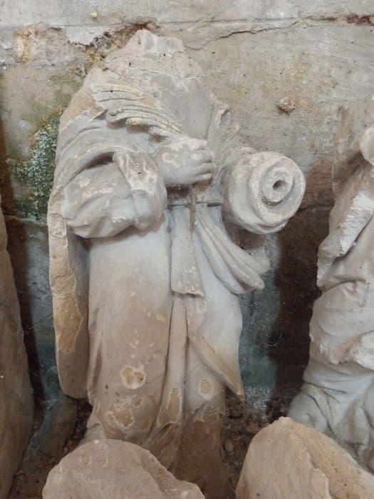Une femme, vêtue d'une robe et d'un manteau, attaché à la taille, tient dans main droite une palme. Il manque la main gauche et la tête. Badigeonnée en gris. Traces d'ancienne polychromie.