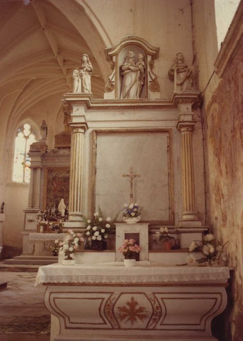 autel latéral, retable, 3 statues, tabernacle avec des représentations de l'Education de la Vierge, une Vierge à l'Enfant et une sainte Catherine
