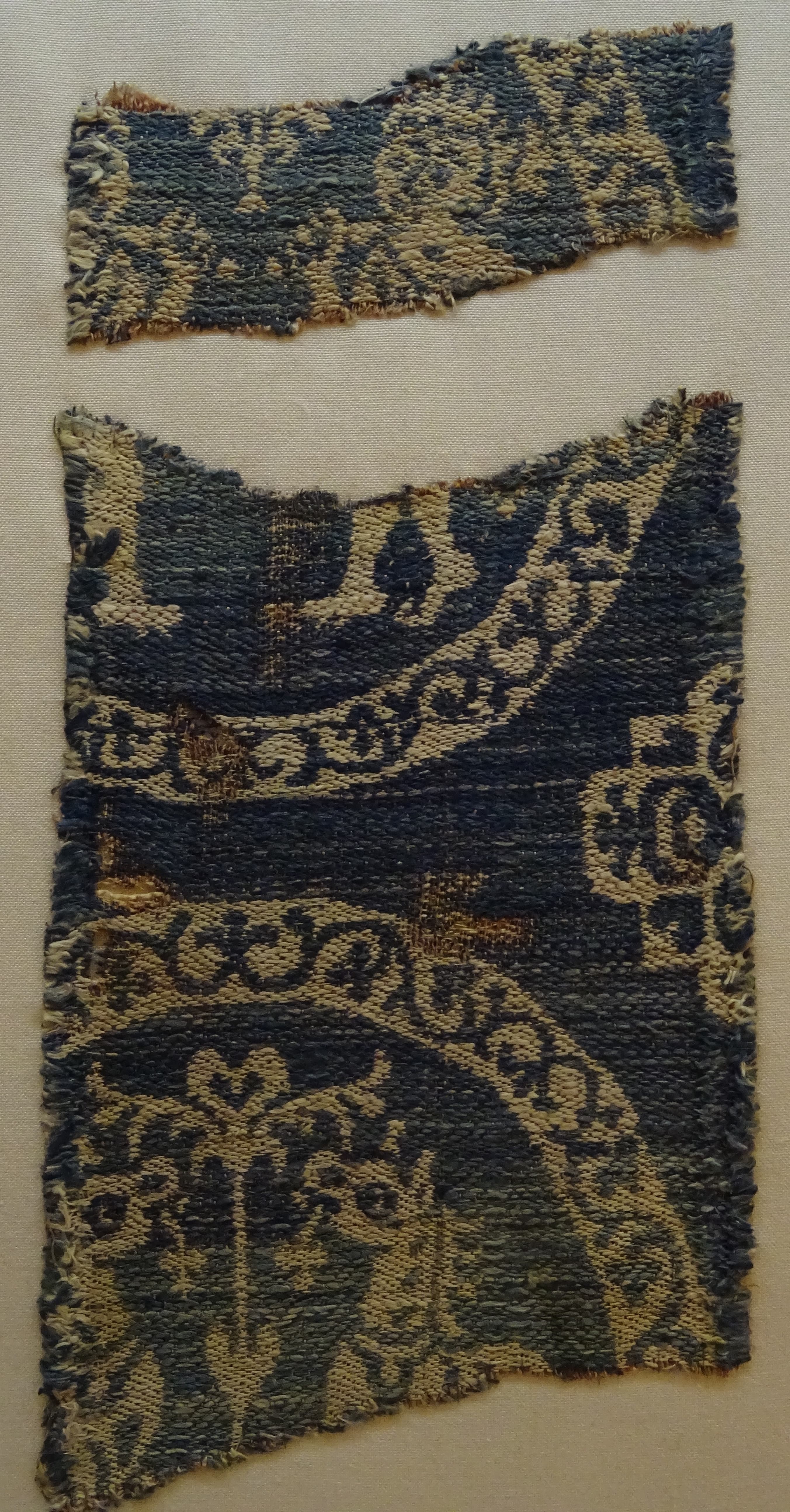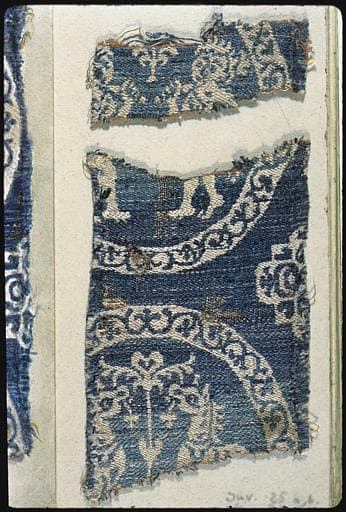Deux fragments d'un samit façonné en soie au décor de médaillons circulaires (rinceaux bleus sur fond blanc).