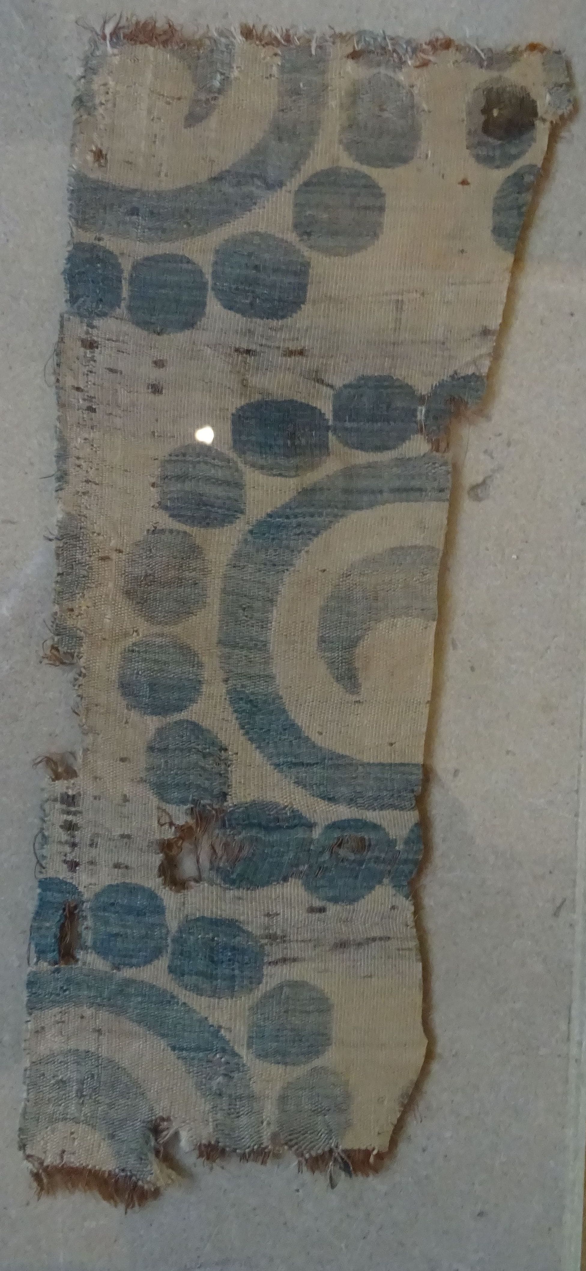 Sur le fragment rectangulaire, se répètent sur fond bleu des médaillons perlés, meublés d'un croissant.