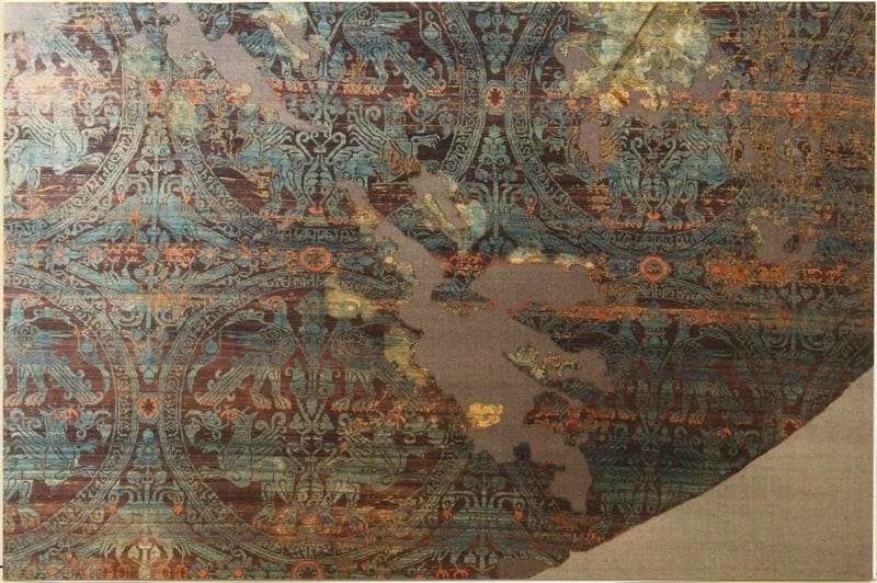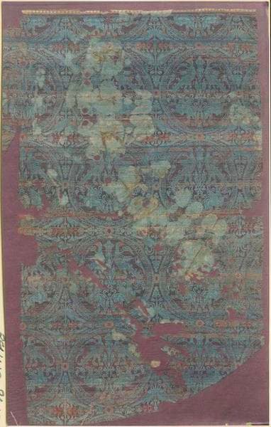 Samit en soie à dessins bleus et rouges.
