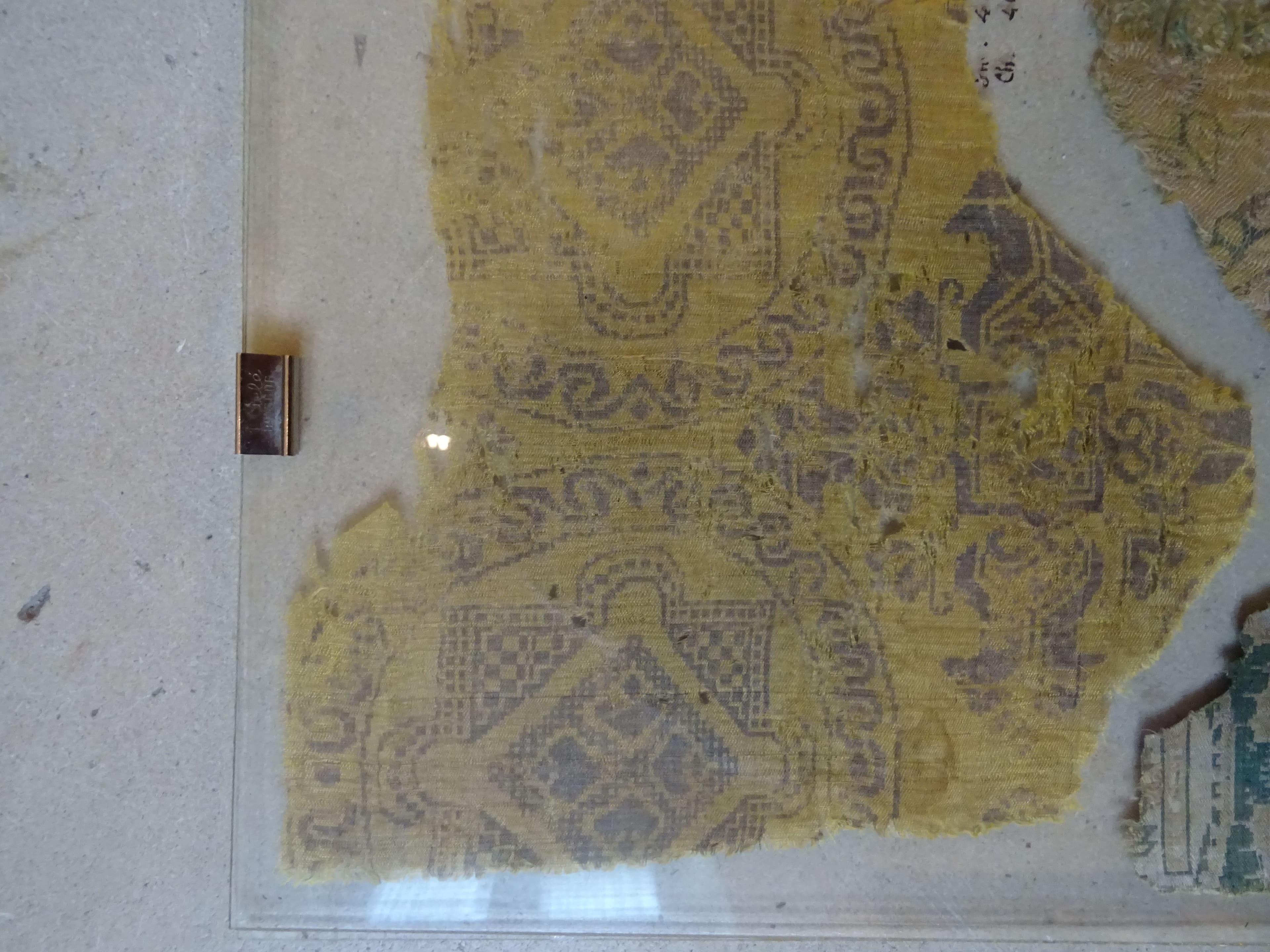 Le fragment est décoré de deux médaillons meublés de motifs géométriques (échiquier, damier…) ; grand fleuron en croix dans l'écoinçon.