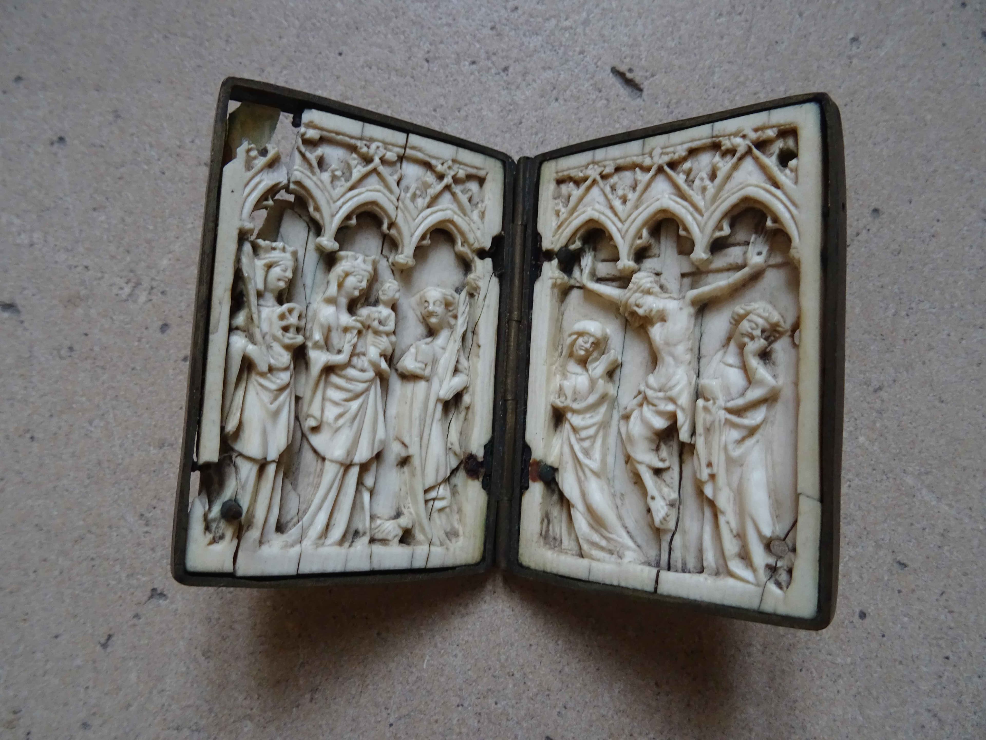 Diptyque en ivoire sculpté. Panneau droit percé de trois trous, au bord droit : rivet fixé au bord gauche du panneau gauche. Monture de cuivre à charnière.