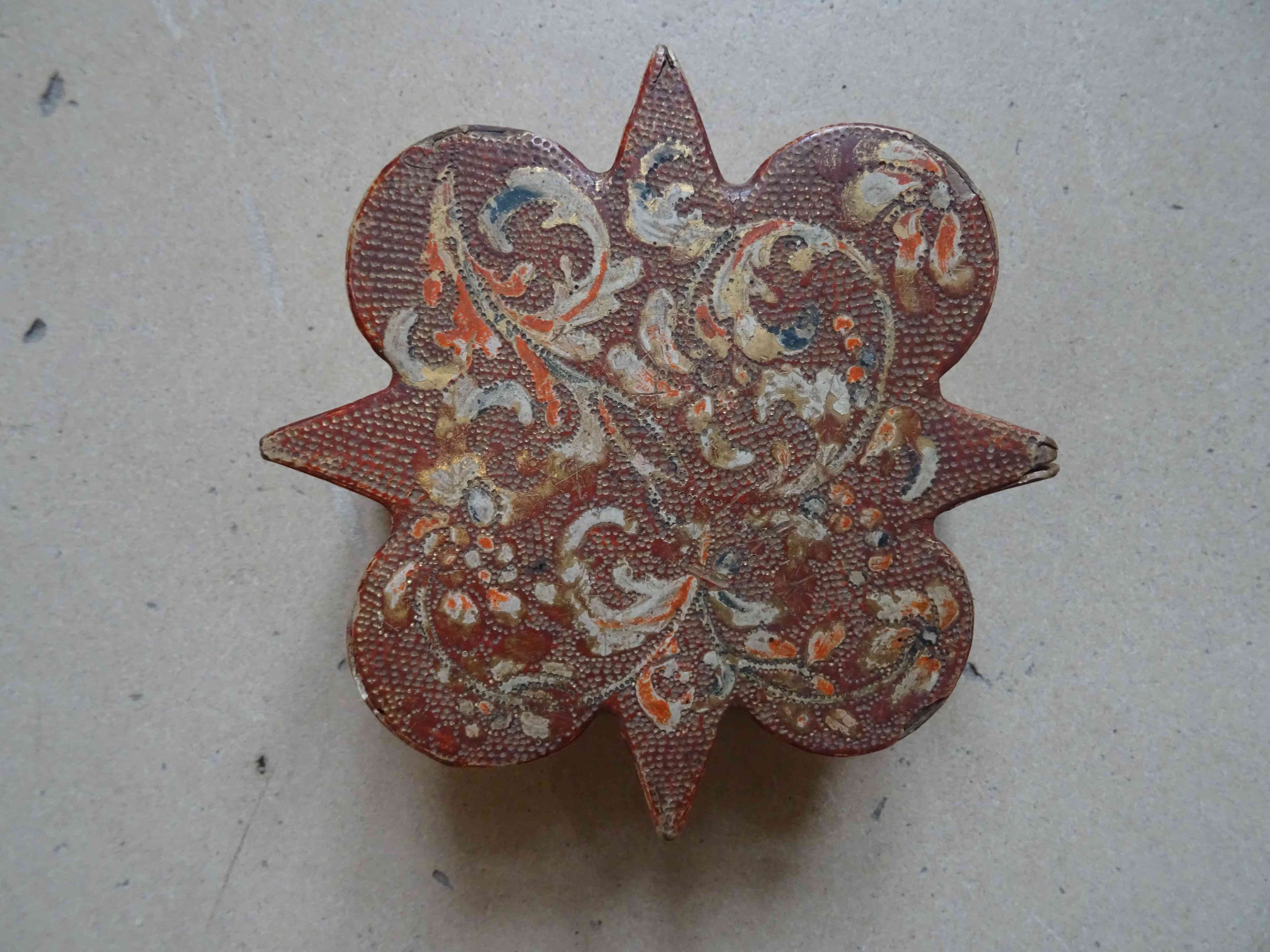 La boîte, en forme de quadrilobe, est fermée par un couvercle décoré de rinceaux peints sur un fond de petits trous.