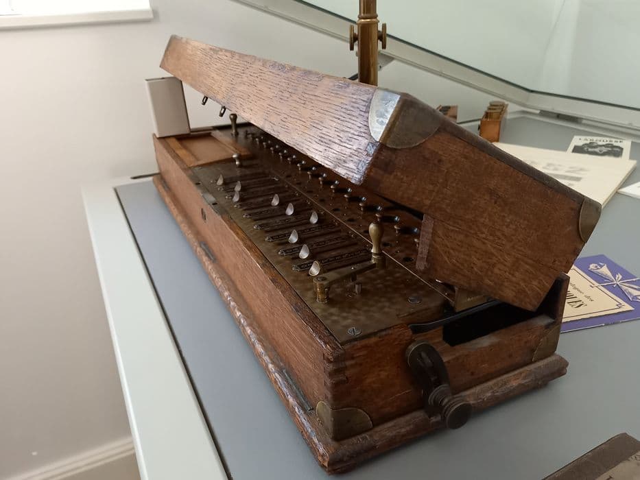 Il s’agit d'une machine à calculer, qui ressemble à la pascaline. 'est un instrument en bois et laiton de forme allongée, le couvercle se fixe grâce à des charnières qui s'emboîtent dans la caisse de l'objet. Une partie du dessus de la boîte est est amovible et sert de réserve. Le dessus est entièrement recouvert d'une plaque de laiton rivetée avec des manivelles, un compteur, des boutons et des plaques numérotées. Un levier sert aux additions et aux multiplications et aux soustractions/divisions. La machine est contenue dans la boîte en chêne. La platine (partie?) en bronze se compose d'une partie fixe et d'un chariot mobile. Sur la partie fixe on distingue de droite à gauche : la manivelle d'entraînement qui est repliable ; les curseurs d'inscription ; le levier d’addition et de soustraction ; la plaque en verre dépoli pour l'inscription des résultats intermédiaires.