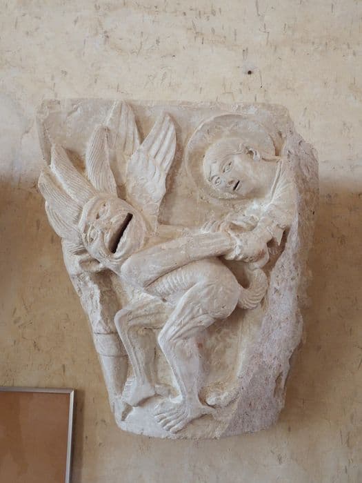 fragment de chapiteau historié : Raphaël maîtrise le démon Asmodée