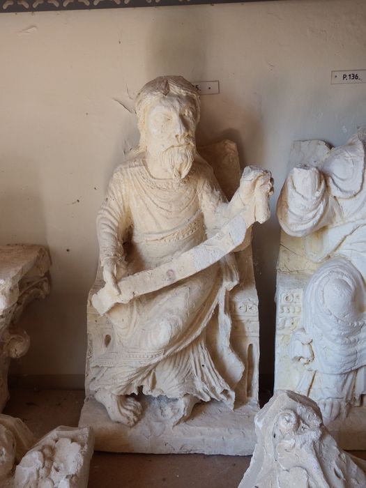 Estampage relevé à la façade occidentale de la cathédrale de Chartres, portail nord, linteau, deuxième apôtre à partir de la droite. Plâtre du dépôt lapidaire du musée de l'oeuvre de Viollet-le-Duc. Appartient à l'ensemble historique mobilier (PM89002613) constitué de 384 fragments sculptés en pierre provenant de la basilique Sainte-Marie-Madeleine de Vézelay et 151 plâtres réalisés lors de la restauration de la basilique par Eugène Viollet-le-Duc au 19e siècle.
