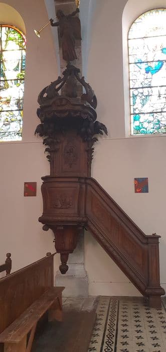 Chaire suspendue à culot composé de deux étages galbés. Escalier droit à droite, cuve semi-circulaire galbée, abat-voix plat surmonté d'une couronne fermée et d'un ange jouant de la trompette, dorsal encadré par deux palmiers.