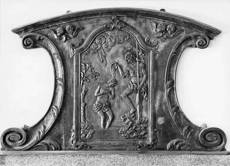 Panneau des fonts baptismaux. panneau sculpté en bas-relief représentant le baptême du Christ. Base rectiligne, ailerons limitant les côtés et sommet légèrement incurvé.