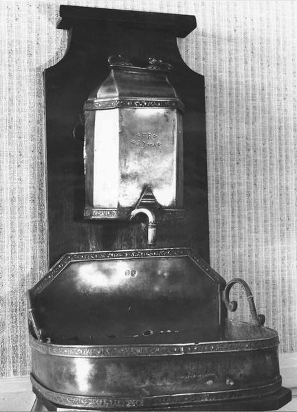 Bassin de plan rectangulaire, aux angles antérieurs arrondis, à la paroi postérieure surélevée. Réservoir aux faces rectangulaires, de plan trapézoïdal, muni d'un couvercle de même plan et de profil galbé. Robinet en laiton.