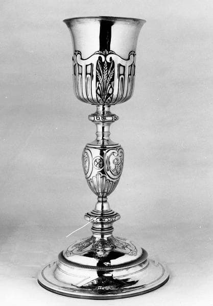 Pied circulaire au bord aplati et au sommet légèrement bombé. Noeud ovoïde entre 2 collerettes. Fausse coupe ajourée.