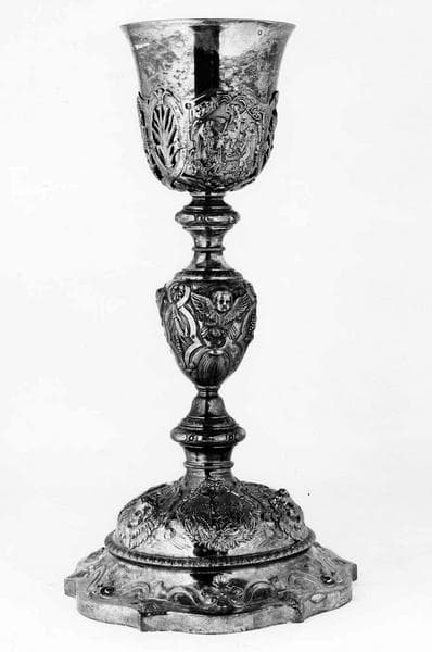 Pied : argent. Coupe : argent doré. Pied en forme de dôme et dont le bord dessine 6 accolades. Noeud ovoïde entre 2 collerettes. Fausse coupe ajourée.