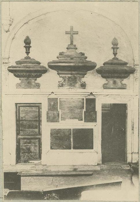 En forme de sarcophages surmontés l'un d'une croix et les deux autres d'un pot à feu. Le tout encadré dans une arcade soutenue par deux consoles sculptées, avec tête d'ange à l'amortissement. Trois tablettes, encadrées de moulures, portaient des inscriptions qui ont été effacées au ciseau.