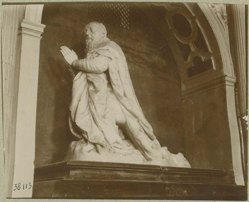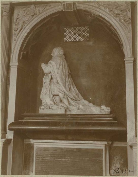 Cénotaphe en marbre noir, surmonté d'une statue représentant le défunt agenouillé, en marbre blanc, le tout placé sous une arcature cintrée.
