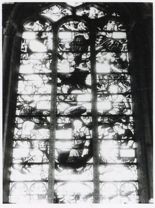 La fenêtre du choeur, côté Nord, est séparée en trois baies par deux meneaux. Les sybilles sont disposées comme les rois d'un arbre de Jessé, sur fond bleu ; chacune d'elle porte un cartouche rectangulaire où est inscrite son nom et sa propriété.
