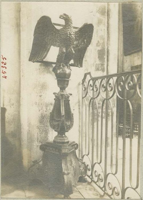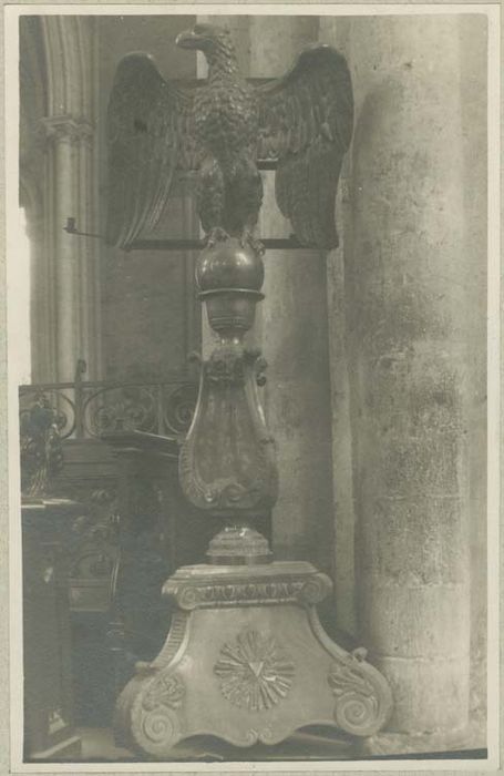 Base triangulaire reposant sur trois pieds griffes. Le fût est coposé d'un vase à trois faces en formes de lyres. Il porte une boule sur laquelle est posé l'aigle aux ailes éployées qui supporte le pupitre.