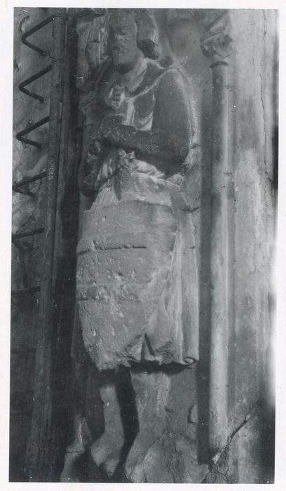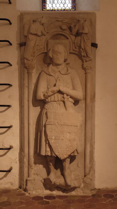 Statue funéraire. Défunt placé sous une arcade gothique trilobée, retombant sur colonnettes, avec deux anges debout des deux côtés du coussin sur le quel repose la tête du défunt, avec un lion aux pieds.