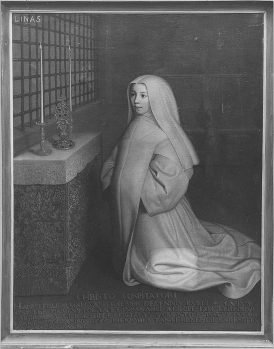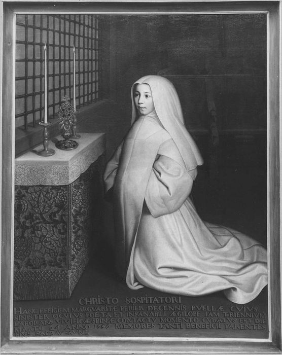 inscription (latin) : Hanc effigiem Margariae Perier, decennis puellae, cujum sinister oculus fata et insanalite jam tiennium labarans, vivificae spina contactu monunto curatus inter die martii 24 anno 1696, memores tanti beneficii parentes ejus sacravernut. Date : 1696 (?).
