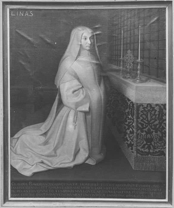 inscription (latin, incomplète) : Claudia Baudran XV annos nata, horribili hotius abdoninis tumore, quo jam perbiennimu et amplius laborabat, medicis jam ad piriculosinimam sectionam properantibus, puncto temporis nullo, vel artis vel natura prasidio liberator, hanc effigiem tanti miraculi nonumentum vivifica saloatoris spina, cujus benificio ...
