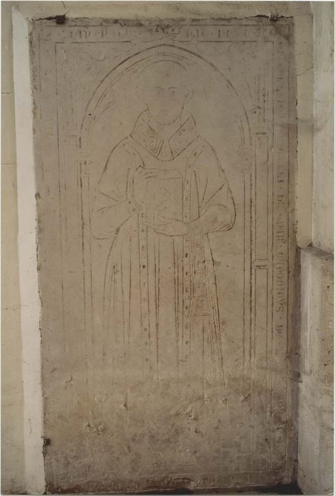 Dalle funéraire à effigie gravée. Défunt sous une arcade trilobée.