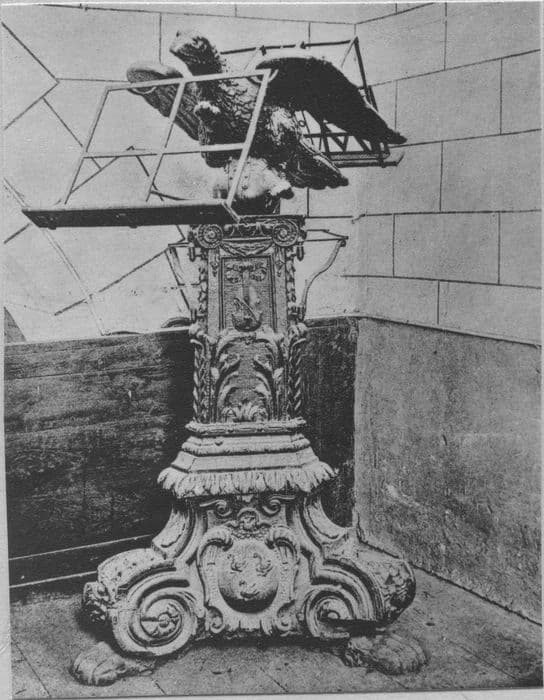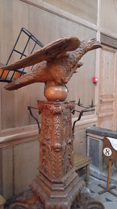 Base à trois volutes et trois faces ornées d'écussons, portant un corps en forme de prisme triangulaire orné de feuillages et d'instruments de musique. Le tout supporte un aigle. Un remaniement a joint l'aigle au corps par une sphère et a articulé sur le corps, sur l'aigle et sur la sphère, des tiges métalliques pour y installer deux portes-livres et des cierges.