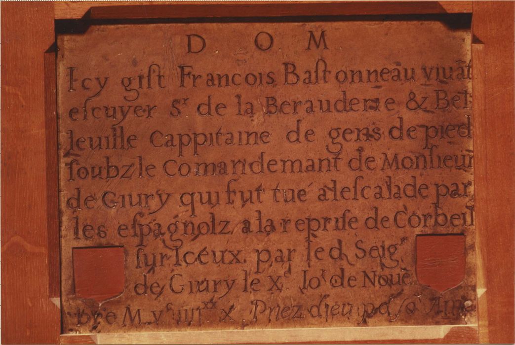 Epitaphe : Dom icy gist François Bastonneau vivant escuyer Sr de la Bérarderie et Belleville capitaine des gens de pied soulz le commandement de Monsieur de Givry qui fut tué à l'escalade par les espagnols à la reprise de Corbeil sur iceux le X jour de novembre MVcIIIIxxX, priez Dieu pour so ame. Date : 1590.