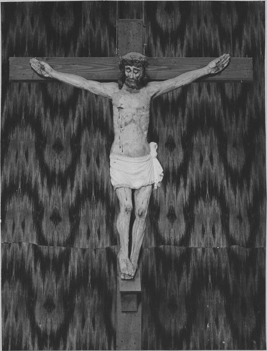 Ce Christ en croix d'une physionomie douloureuse, d'un caractère réaliste, provient semble-t'il de l'ancien mobilier de l'église. Il a été repeint au 19e siècle.