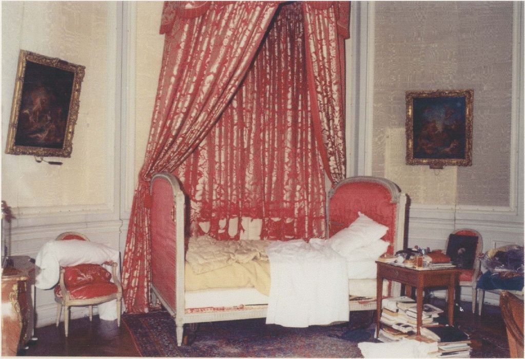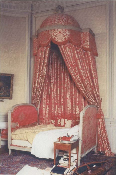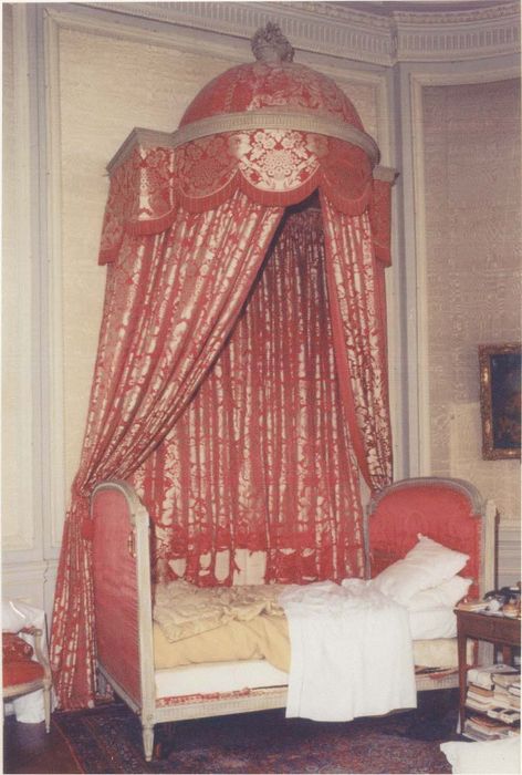 Ensemble de meubles : 4 fauteuils à la Reine et deux chaises, identiques au mobilier du salon rouge, une duchesse brisée, un lit de travers à dais suspendu et à deux chevets ; tissu rouge à fleurs.