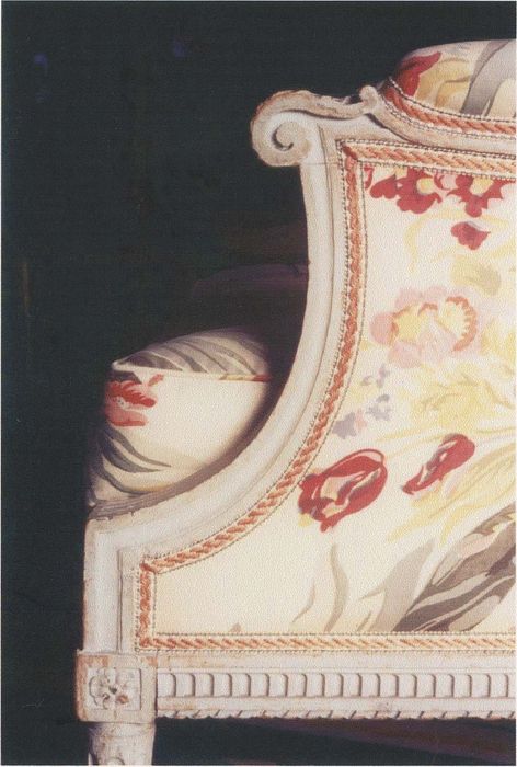 Ensemble de meubles : quatre fauteuils à la Reine, 2 bergères à la Reine. Rembourrés, garni de tissu, à fleurs et perdreaux, dossier plat à anse de panier, guirlandes de ruban sur les traverses, pieds tournés en fuseau, cannelés, rosaces dans les dés, accotoirs avec feuilles d'acanthe sur la tête. Un lit à la polonaise à dais plat rectangulaire.