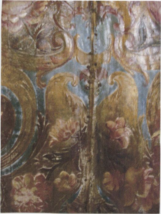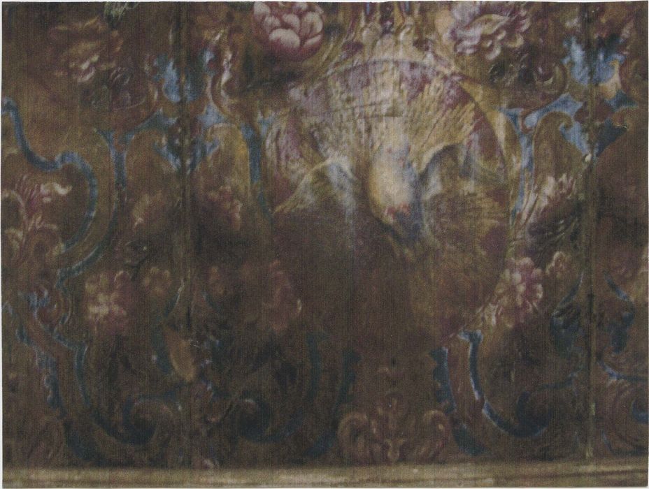 Colombe du Saint Esprit en médaillon au centre, ornementation : fleurs et rinceaux.