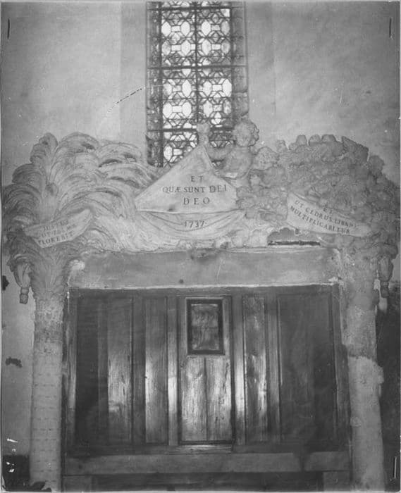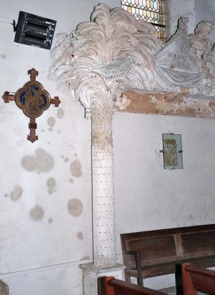 Fronton triangulaire reposant sur deux fûts de colonnes en forme de troncs de palmiers. Au centre du fronton un ange debout tend la partie centrale d'une draperie, dont les extrémités nouées retombent de part et d'autre des colonnes. Du côté gauche du fronton, gros bouquet de palmes, du côté droit gros bouquet de fleurs.