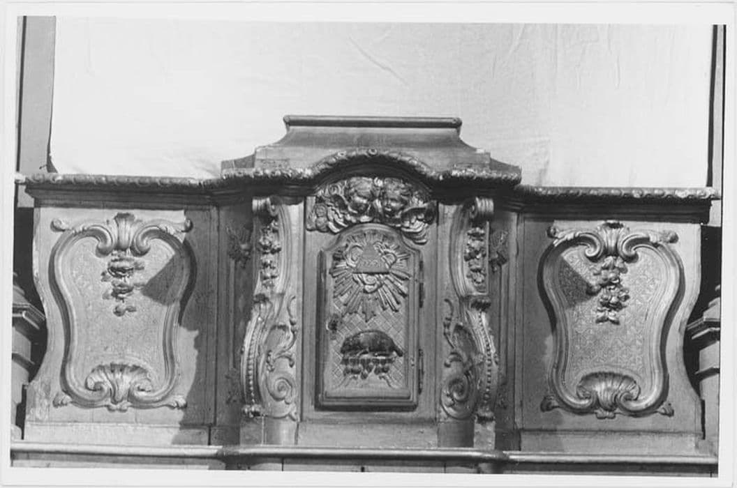 Meuble rectangulaire comprenant une partie centrale formant avancée encadrée de deux panneaux symétriques. La partie centrale qui est le tabernacle proprement dit comprend une porte ornée de l'agneau mystique et d'une gloire, le tout surmonté de deux têtes d'angelots. Les jouées sont en forme de volutes ornée de rinceaux. Les panneaux latéraux plus simples comportent une moulure accompagnée de deux coquilles et d'une petite guirlande de fleurs.