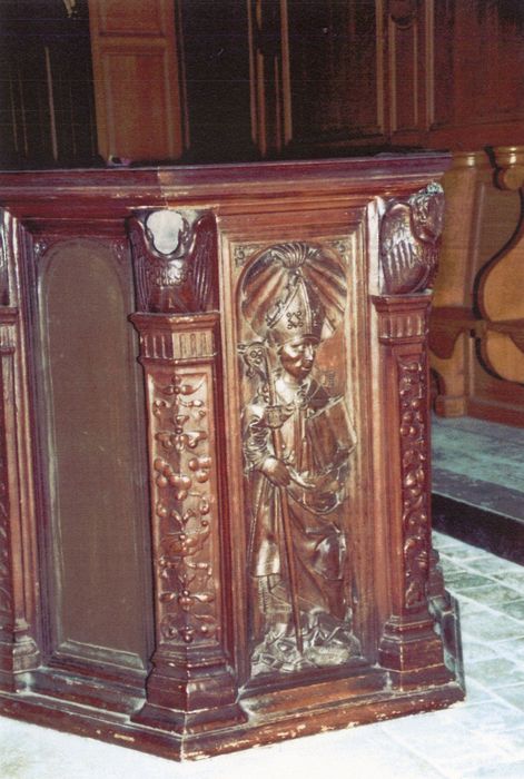 Chaire à trois panneaux hexagonaux, sur le panneau de face : sans doute la statue de saint Thomas Beckett, en bas-relief ; aucune sculpture dans les deux autres panneaux ; bustes d'anges ailés sculptés aux angles, avec la face arasée.