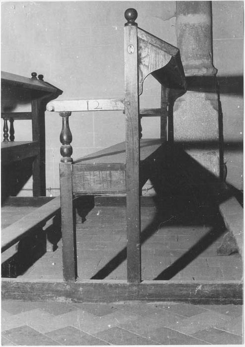 Trente huit bancs répartis dans les deux nefs ; onze bancs portent des numéros gravés dans le bois 17bis 27 ; assemblage par chevilles ; aucune trace de clou ; travail exécuté à la main ; traces d'outils encore visibles ; supports des bras en bois tourné, presque tous différents ; dimensions variables.