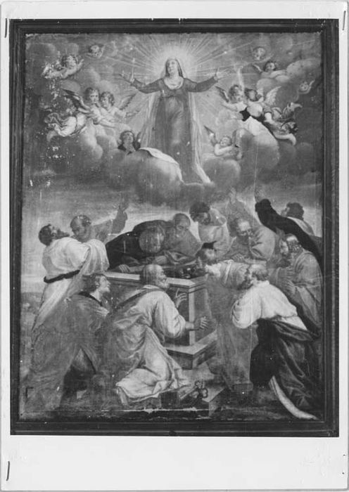 Composition du tableau en deux parties ; partie basse : apôtres formant un cercle autour du tombeau de la Vierge ; certains apôtres se prosternent, d'autres lèvent les bras en direction du ciel et de la Vierge ; partie haute : séparés par un bandeau de ciel gris, Vierge vêtue en robe rouge et voile blanc, bras écartés, tête auréolée avec rayons, et placée sur des nuages, en demi cercle, et entourée d'anges.