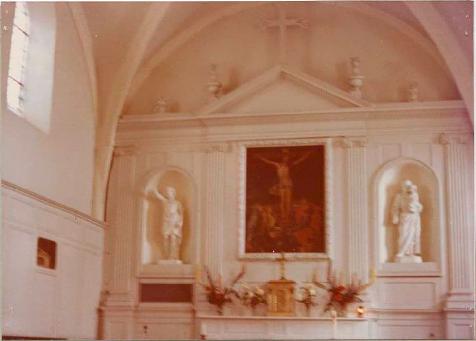 Retable à fronton triangulaire, entouré de deux pilastres cannelés à chapiteaux corinthiens ; pot à feu sur la corniche ; deux niches en parties latérales.