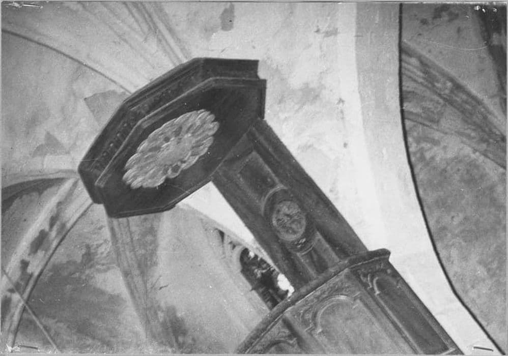 La cuve de la chaire se compose de cinq panneaux rectangulaires. Restes de polychromie sur certaines moulures.