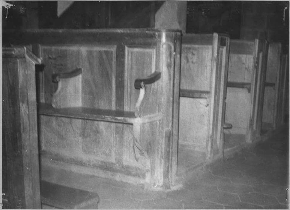 Bancs à dossiers fermés ; ouverture sur les allées ; accoudoirs en volutes sculptées ; aucun décor particulier ; des chiffres sont gravés sur certains bancs.