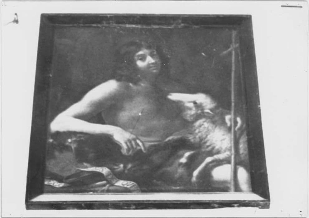 Saint Jean-Baptiste assis avec l'agneau sur les genoux et tenant la croix de la main gauche.