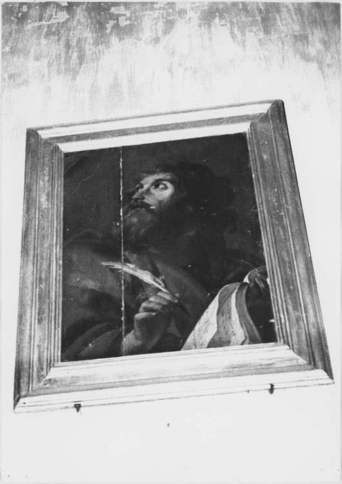 Belle oeuvre expressive d'un style assez proche de lécole française des XVIe et XVIIe siècles. La dimension assumée de portrait restreint à la seule représentation de la tête ne permet pas d'identifier plus clairement l'évangéliste représenté, mais affirme encore davantage le caractère personnel de l'oeuvre et de fait, son individualité stylistique. A noter l'identité du format et du cadre avec celui du tableau représentant la Vierge à l'Enfant avec saint Jean-Baptiste.