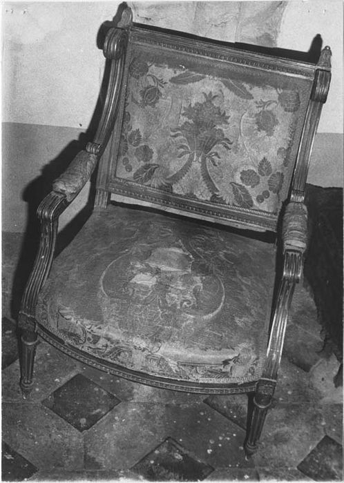 Fauteuil en bois doré recouvert de tapisserie. Décor à volutes.